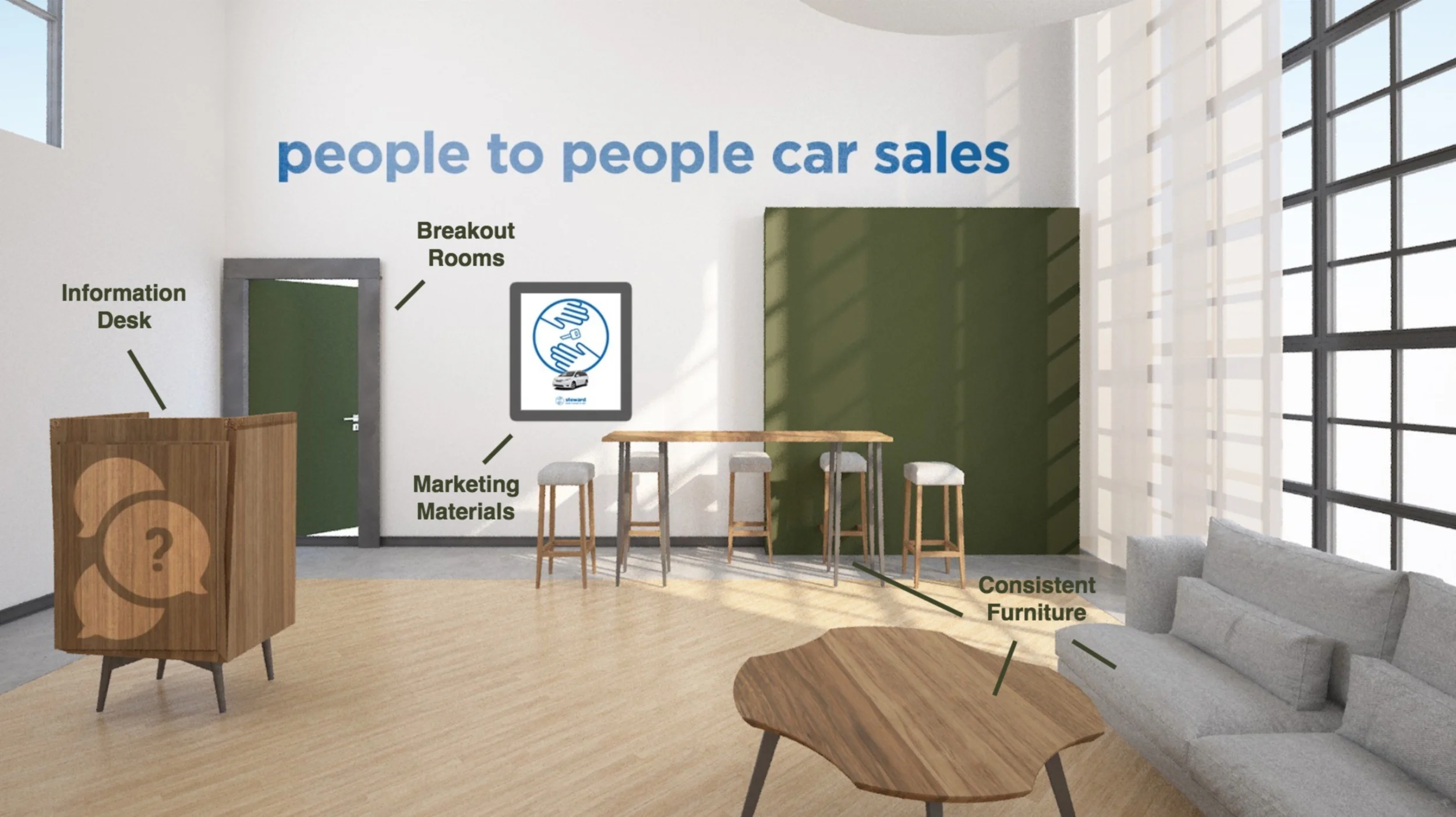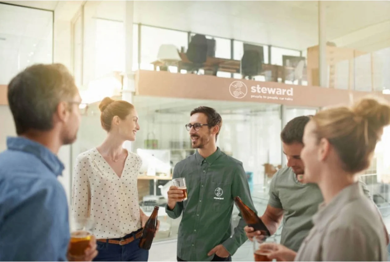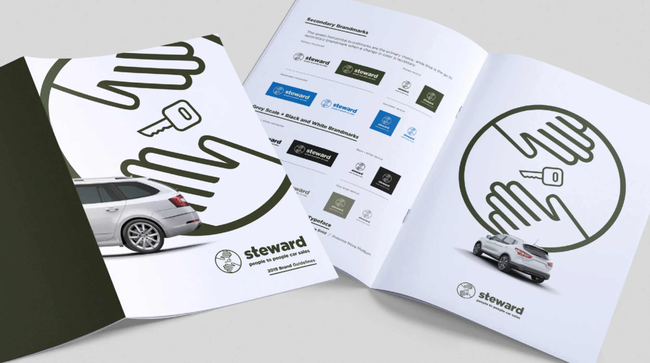 The logo adopts a clean and minimalistic design, aligning with the name “Steward”, the slogan, and brand guidelines. The depiction of hands symbolizes a transparent handoff between the store and the customer, reinforcing the message of "people to people car sales."